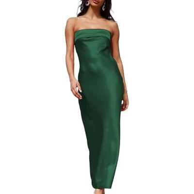 Satin Silk Backless Tube Tops Maxi Dress for Women Low Back Hollow Out Elegant Strapless Long Dresses Wedding Guest