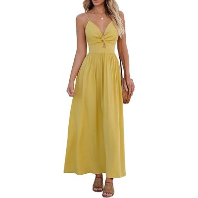Women's Maxi Dress V Neck Twisted Sleeveless Cutout Self Tie Long Dress Summer Formal Dress