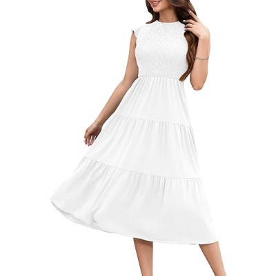 Casual Short Sleeve Summer Dress Crew Neck Smocked Hight Waist Flowy Maxi Tiered Dresses