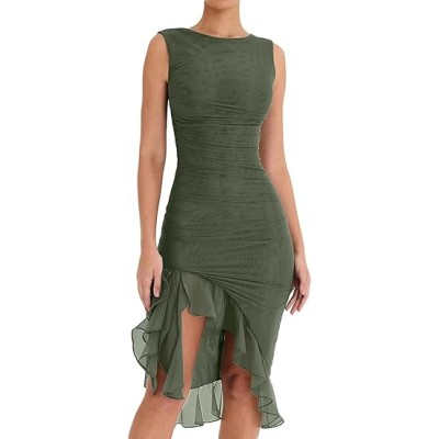 Women's Midi Bodycon Dress Summer Sleeveless Ruffle Mermaid Dress Cocktail Party Tank Dresses for Wedding Guest