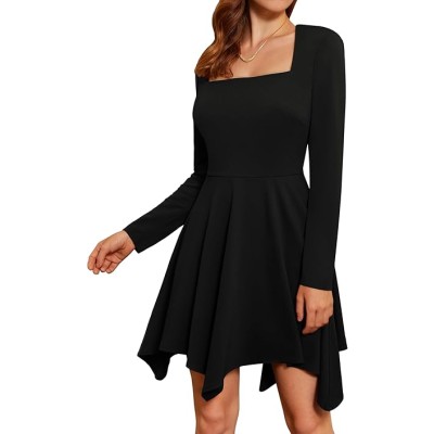 Womens Short A Line Dresses Square Neck Long Sleeve Mini Dress Swing Flare Asymmetrical Hem Party Skater Dress