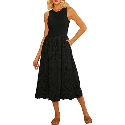 Women's Summer Sleeveless Tank Dress A Line Midi Dress Cotton Crewneck Casual Holiday Dress with Pockets