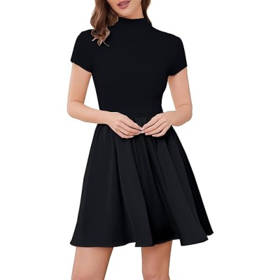 Women Mock Neck Knitted Mini Dress Short Sleeve Patchwork Sweater Short Dress Pleated Flowy Swing Solid Dresses
