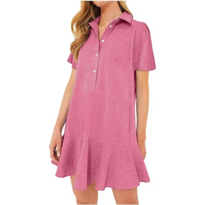 Women's Button Down Shirt Dress Summer Casual Short Sleeve Cotton Linen Ruffle Shift Mini Dresses