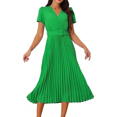 Women's Casual Short Sleeve Wrap V Neck Flowy Pleated Midi Dress with Belt