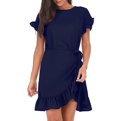 Womens Long Sleeve Round Neck Ruffles Wrap Dresses Party Dress