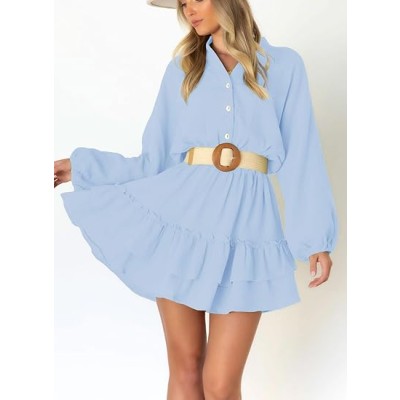 Women's Dress V Neck Long Lantern Sleeves Ruffle Tiered Solid Swing Mini Dress