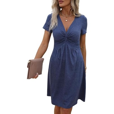 Women's Twist Front Bowknot Ruffle Spring Summer Dress Casual Deep V Neck Elegant Bow tie Flowy Tunic Mini Dresses