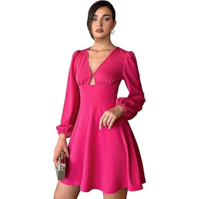 Women's Cut Out Front Lantern Sleeve Dress Deep V Neck Solid Flared Dresses